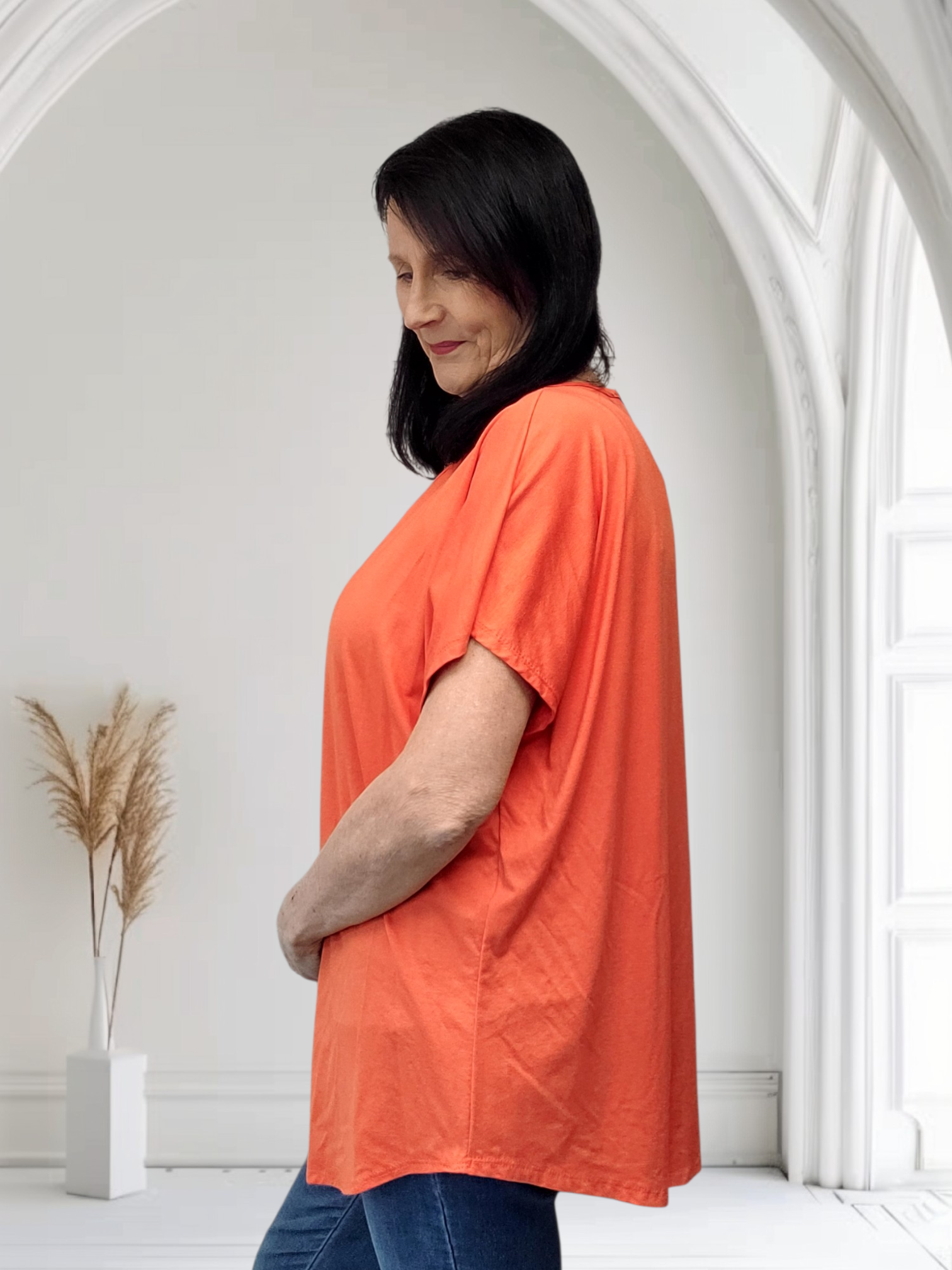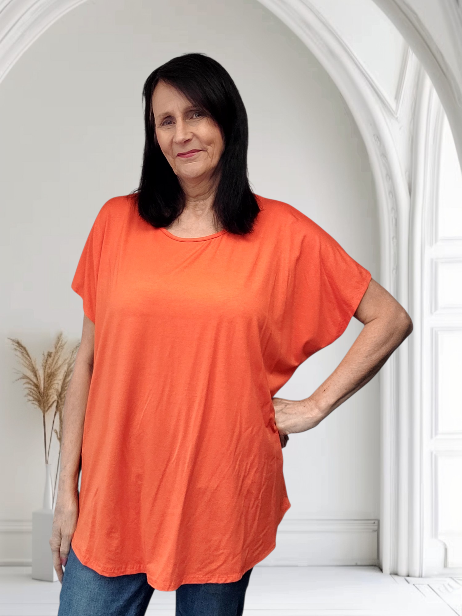 Comfort meets effortless style with this soft and stretchy longline T-shirt. Designed with a classic round neckline and short sleeves, it offers a flattering, relaxed fit that drapes beautifully over the body.